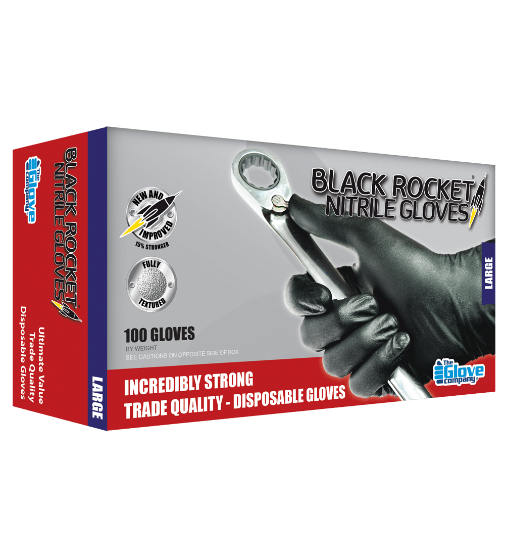 The Black Rocket Nitrile Disposable Gloves represent ultimate value and incredible toughness. • 100% Nitrile • Tough Durability • Cost Effective • Latex Free and Powder Free • Comfort for extended wear • Fully Textured
