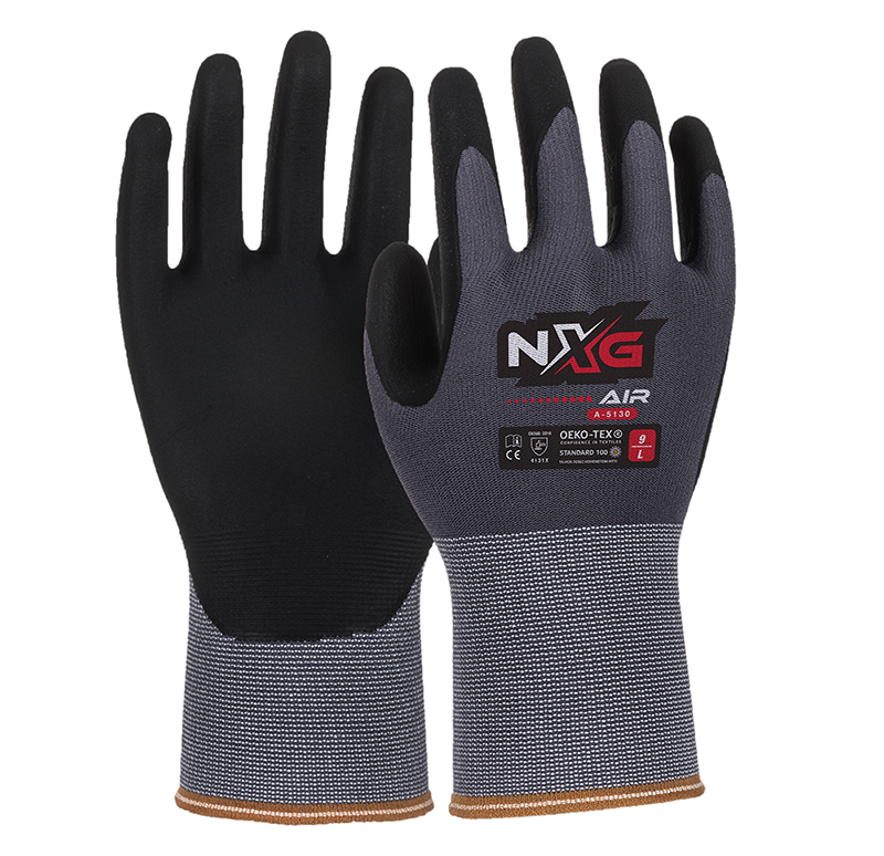 NXG™ have developed a combination of the latest innovative yarns and then coated with a highly breathable nitrile coating to create a glove which “breathes” easily, expelling warm air from within the glove to the outside of the glove, while at the same time wicking moisture away from the hand providing a truly dry and comfortable experience while hard at word. The AIR™ range of gloves are perfect for every day general use where comfort, fit and durability are important.
