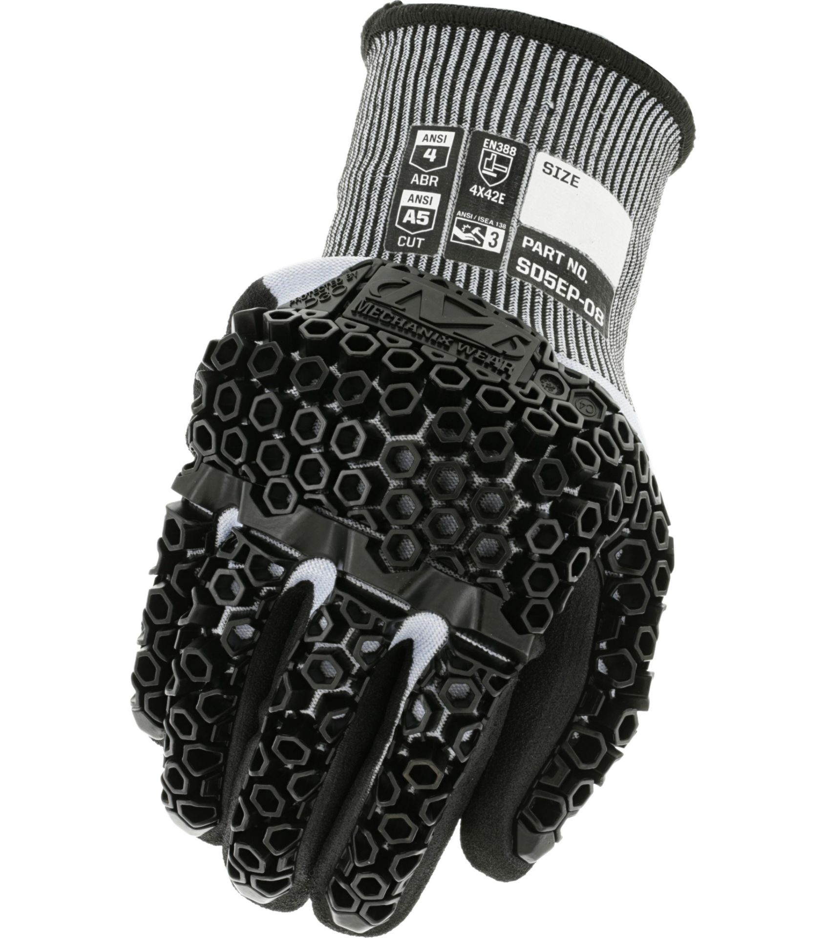 Our SpeedKnit™ M-Pact® SD5EP08 protected by D3O Impact Print™ technology is the first glove of its kind to achieve ANSI Level 3 impact resistance with unrivaled dexterity and best in class cut protection. We use a high dexterity 18 gauge machine-knit blend of HPPE and Tungsten steel to protect working hands with ANSI A5 blade-cut resistance. The working side features a touchscreen capable sandy nitrile palm coating with ANSI Level 4 abrasion resistance for high durability. **Intended Uses**