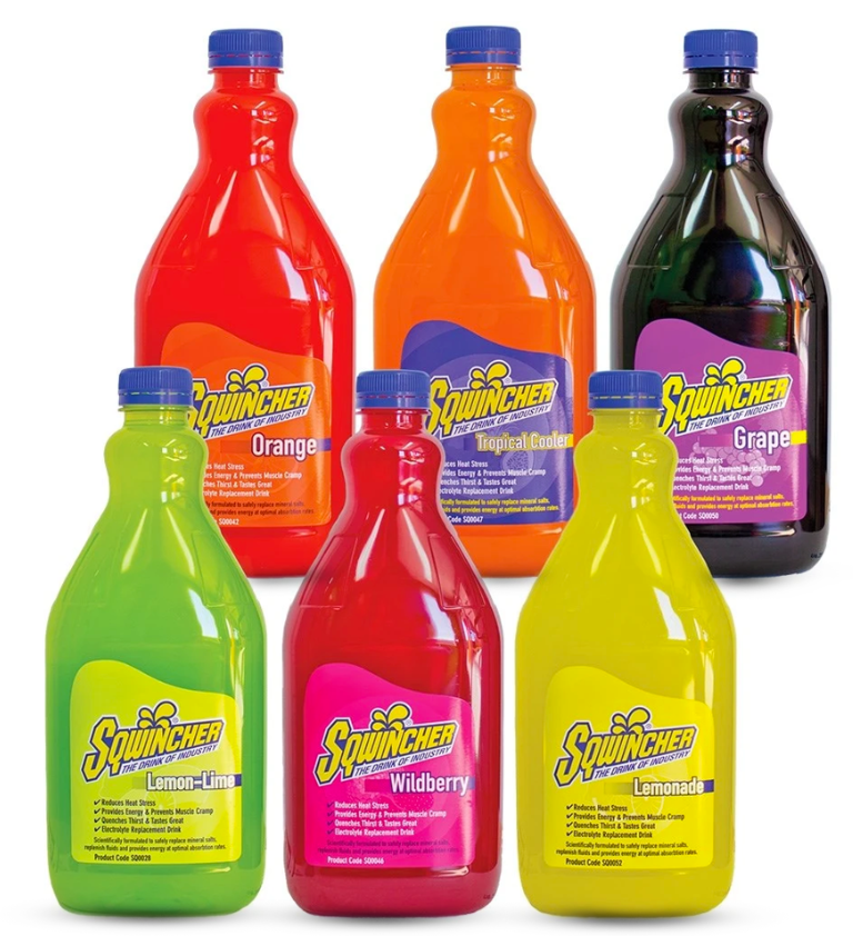 2-Litre Liquid Concentrate bottle yields 20litres of finished product. Mix one bottle into a 20 Litre Cooler, add water and ice to create a hydration station that will keep fluid cold for up to 12 hours. When the body perspires it loses key electrolytes that water alone doesn’t contain. Electrolytes your body needs to keep it stable and functioning properly. That’s where Sqwincher comes in. Sqwincher hydration solutions quickly replace lost fluids containing sodium & potassium, key electrolytes needed to keep the body hydrated, and exactly what your body needs to keep it working well and in tip-top shape. Includes: